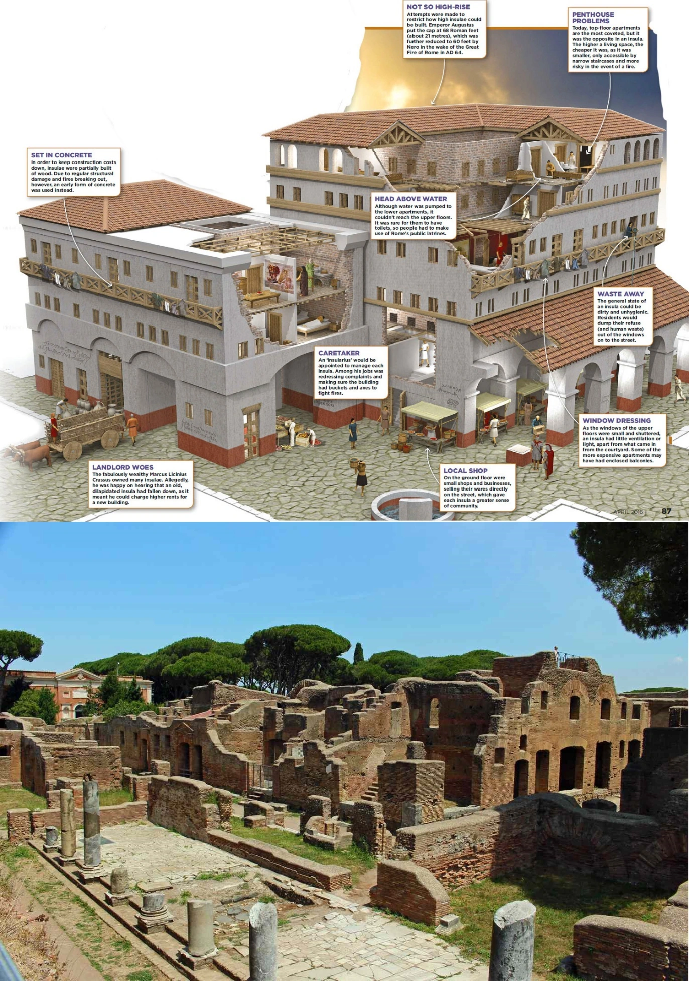 上图:新约时代罗马公寓楼示意图和古罗马港口城市奥斯提亚安提卡(Ostia Antica)出土的古建筑群遗迹。在古罗马的城市里,大部分居民都住在被称为Insulae的公寓楼里,现存最高的是五层楼,越上层的质量越差。少数富有的上流人士住在联排屋(Domus)里,在一、两天路程之外的乡村还可能有别墅(Villa)。在4世纪,当时罗马城里大约有4.2万至4.6万栋公寓楼,而3世纪后期只有1,790栋联排屋。初期教会聚会的地方,就是在这些公寓楼和联排屋里。