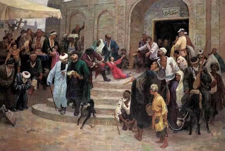 (上图:油画《De Treurdagen》(Jan Voerman绘于1884年),画中左上角的墙上有犹太人家中的Mizrah标志。希伯来语Mizrah(מִזְרָח)的意思是「东方」,特指散居在耶路撒冷西方的犹太人的祷告方向,也指会堂中朝东的那面墙,或指犹太人家中用于指示祷告方向的装饰物,上面会写上Mizrah(מִזְרָח),有的还写上「从日出之地到日落之处,耶和华的名是应当赞美的」(诗一百一十三3),或画上圣地图案。根据所罗门的祷告(王上八33、44、48;代下六34),塔木德规定,犹太人在国外要面向以色列祷告,在以色列要面向耶路撒冷祷告,在耶路撒冷要面向圣殿祷告,在圣殿要面向至圣所祷告。犹太会堂通常会尽量朝向耶路撒冷的方向。如果犹太人祷告时无法确定位置,就应当将自己的心引向耶路撒冷。但以理就是面向耶路撒冷祷告(但六10)。)