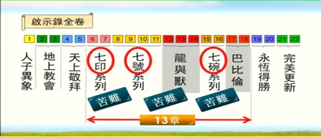 我们从这个图中可以看到启示录从第六章到十八章总共用了十三章的篇幅叙说苦难,在其中整个世界都面对审判,但我们也可以看到神的百姓同样面临逼迫患难,甚或为主殉道,因着邪恶势力的猖獗甚至连活命的指望都灭绝了,「除了那受印记,有了兽名,或有兽名数目的,都不得作买卖。」(十三17)「我又看见那女人喝醉了圣徒的血,和为耶稣作见证之人的血…」(十七6)但是十九章开始峰回路转,基督为祂的百姓争战,并进入永恒的得胜。